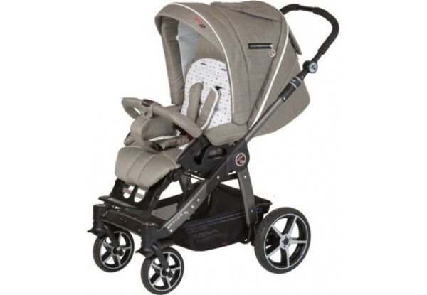 Завдяки повністю розкладаємо спинці прогулянковий варіант також можна використовувати від народження. Стильна та легка рама має невеликі розміри по ширині і компактно складається для транспортування або зберігання. Легкі колеса з повітряними камерами і регульована задня підвіска забезпечують колясці плавний хід по будь-яких дорогах. Телескопічна ручка легко адаптується до зростання батьків.