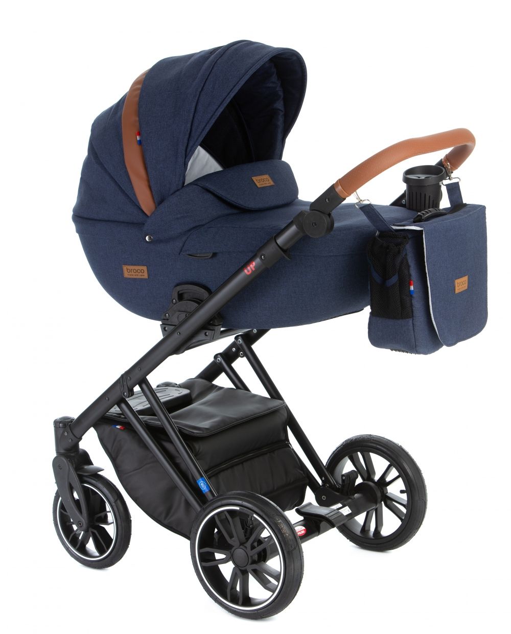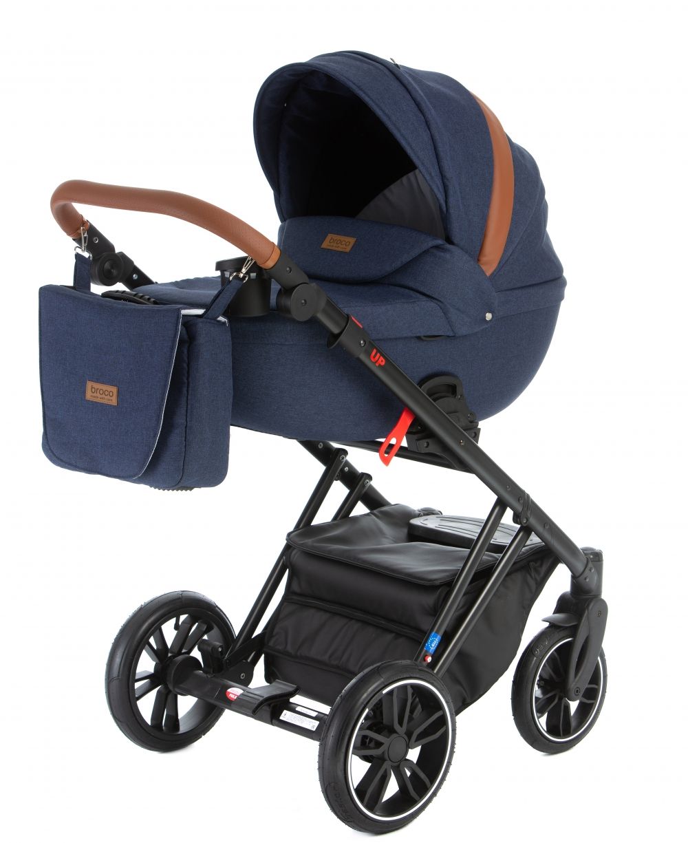 Універсальна коляска Broco Up - символ стриманого стилю в міських просторах. Маневрена модель має компактні розміри та високу функціональність. Ширина коляски дозволяє пройти крізь проходи вузьких ліфтів і під'їздів. При цьому спальне місце малюка залишається таким же за розміром, як у інших великих колясок. Зовнішній текстиль виконаний з високоякісної екошкіри, що є стійкою до забруднень та зношування. Спинки регульовані у спального місця люльки і в прогулянковому блоці. Зручна ручка рами, унісекс-сумка для батьків - все зроблено в стилі кращих європейських традицій. Прогулянковий блок оснащений ременями безпеки і зручним регульованим сидінням. Особливістю прогулянкового блоку є зручні підніжки з екошкіри з досить високим бортиком, а також дуже м'який і теплий вкладиш на сидіння для холодної пори. Надувні колеса мають високу амортизованість проти ударів і чудову прохідність по нерівних дорогах.