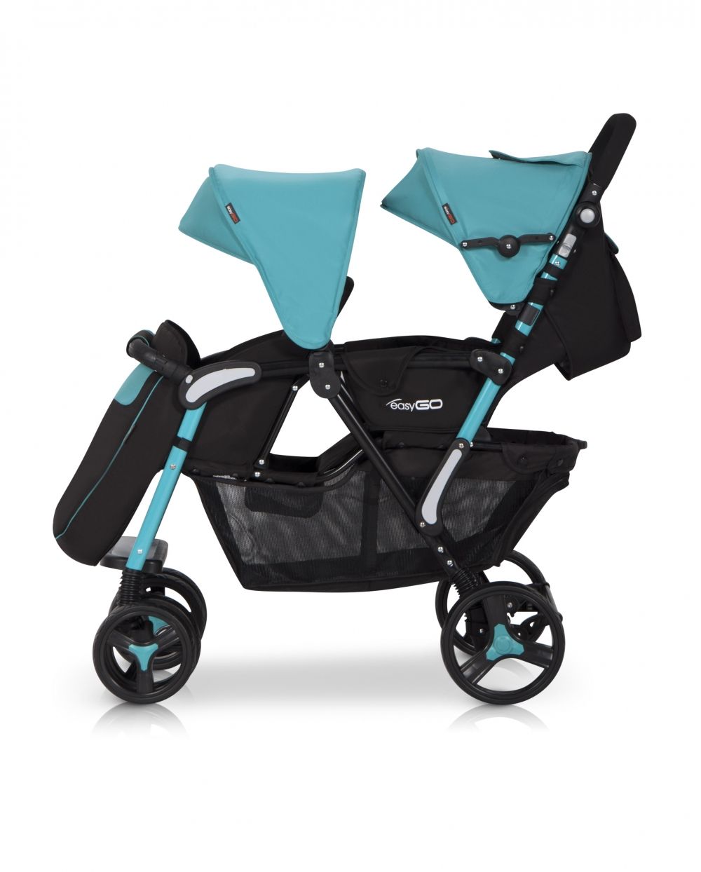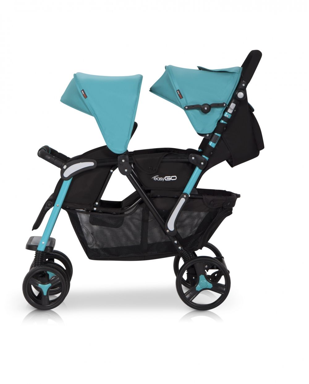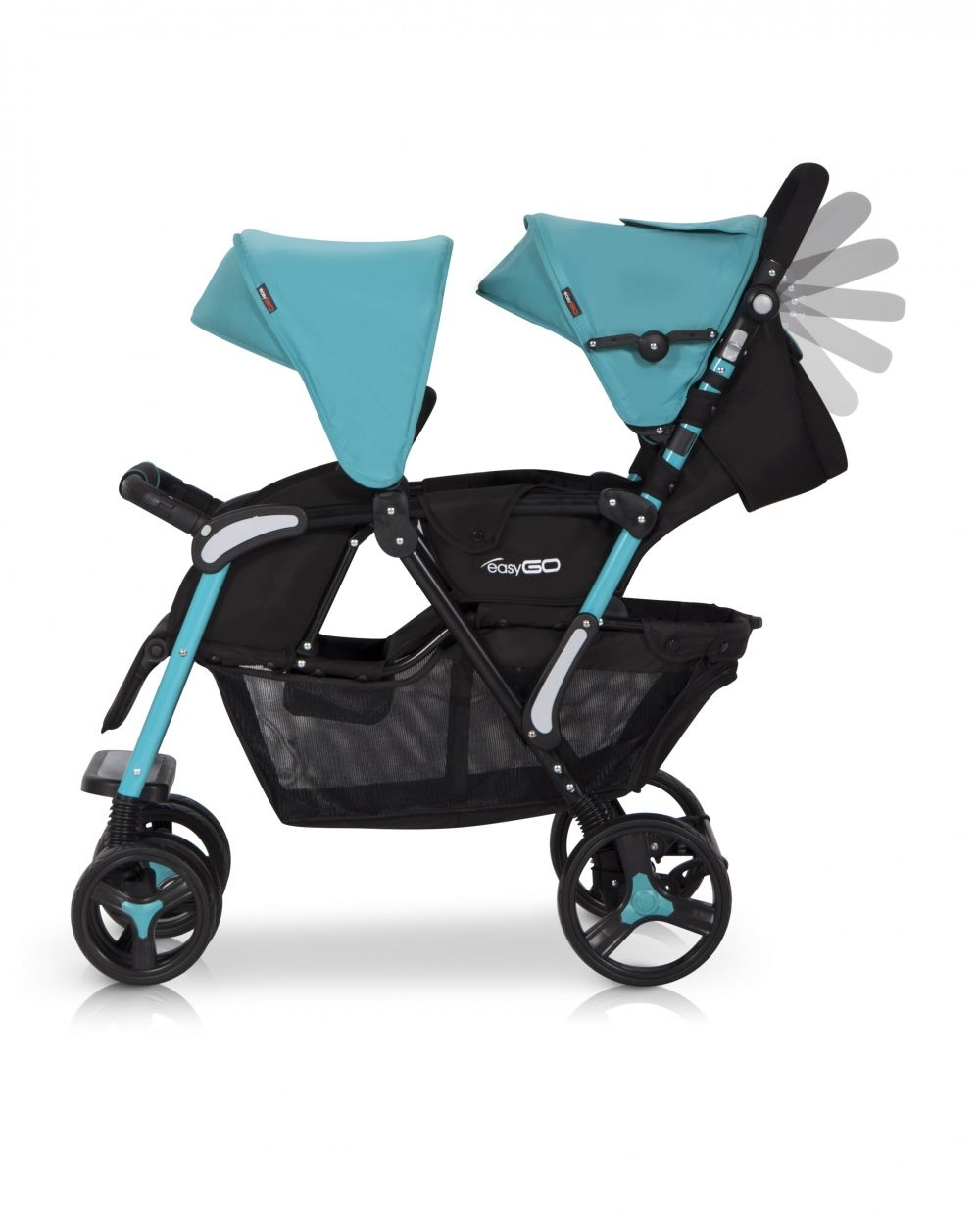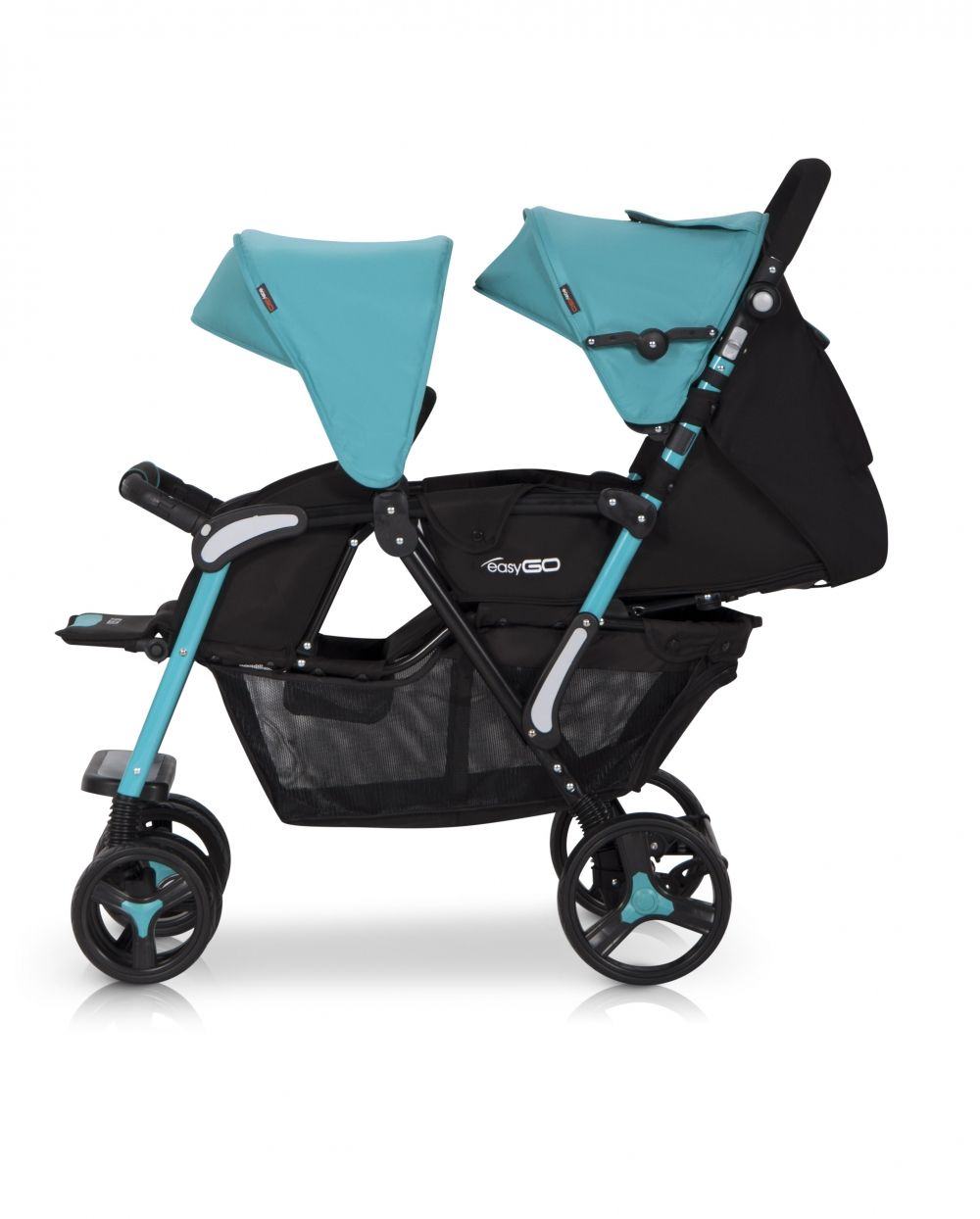 Дитяча прогулянкова коляска для двійні EasyGo Fusion Duo – сучасна дитяча коляска для близнюків або ровесників. Переднє сидіння призначене для дітей у віці від 6 місяців і до 15 кг ваги, заднє – від народження до 15 кг.
