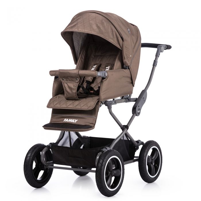 Family має класичну базу з 4 великими надувними колесами, що значно підвищує її прохідність і полегшує перебіг, а використовувана система амортизації зробить будь-які нерівності на дорозі невідчутними для сплячої в ній дитини.