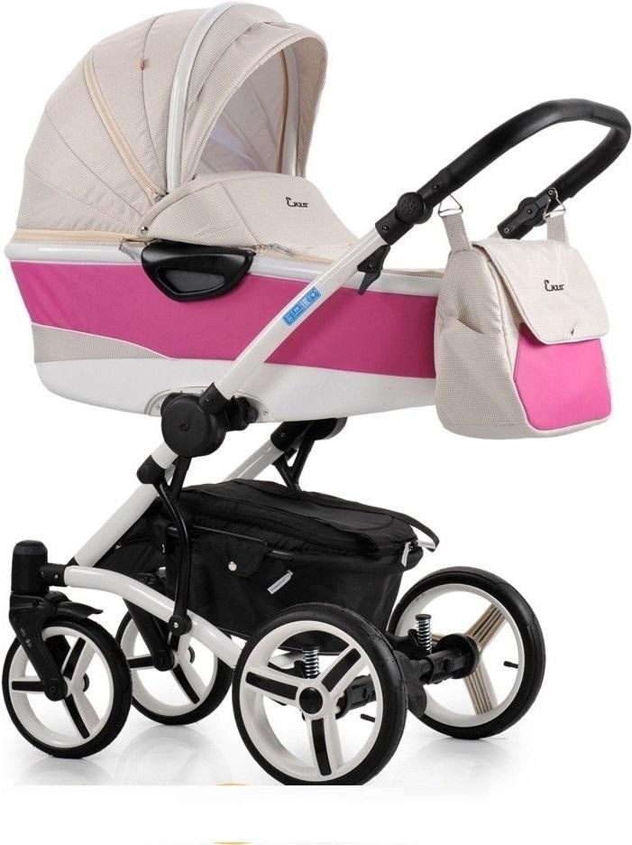 Яскраві кольори, біла глянцева рама і вставки з алюмінію по корпусу люльки роблять цю коляску ексклюзивною.