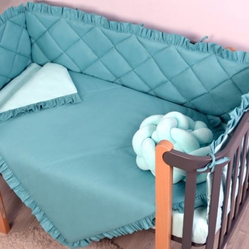 Постільний комплект виготовлений з натуральної бавовни, який володіє хорошою повітропроникністю, а найголовніше безпечний для дитячої чутливої ??шкіри, оскільки не викликає алергічних реакцій при використанні, має високу зносостійкість і довговічність, після прання зберігає свій зовнішній вигляд і міцність швів. Підодіяльник і чохли бампера на блискавці, що зручно і практично у використанні. Наповнювач бампера холлофайбер - гіпоалергенний, добре тримає форму, а подушки і ковдри - soft fiber - м'який і приємний на дотик, забезпечує «дихаючі властивості» і терморегуляцію. Ковдра простьобана, що забезпечує збереження форми виробу після прання.