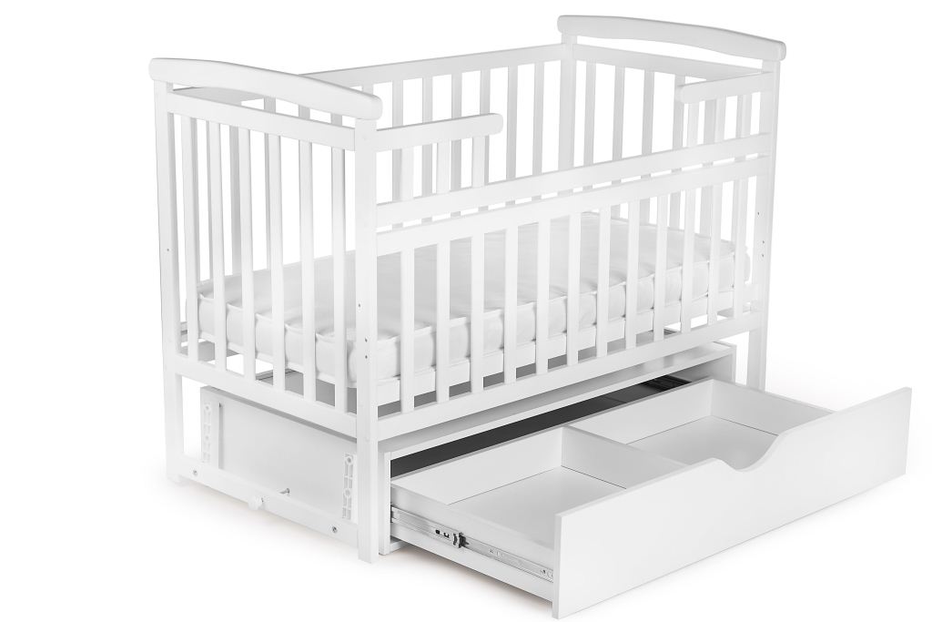 Дитяче ліжко Bimbi з опускною боковиною та шухлядою - це ліжечко, яке гарантує вашому малюкові комфортний і безпечний сон, а також буде красиво й гармонійно виглядати у будь-якому інтер'єрі. Воно призначене для діток з народження до 5 років. Виготовлене з екологічно чистих і сертифікованих матеріалів. Всі фарби і лаки, що використовуються для покриття - виключно на водній основі, гіпоалергенні та повністю безпечні для здоров'я вашої дитини. Ліжечко Bimbi має маятниковий механізм поперечного гойдання з фіксатором, а також можливість опускання бортика. Висоту спального місця можна регулювати на двох рівнях. Всі деталі мають безпечні округлі форми, а також бортики з накладками-гризунками.
