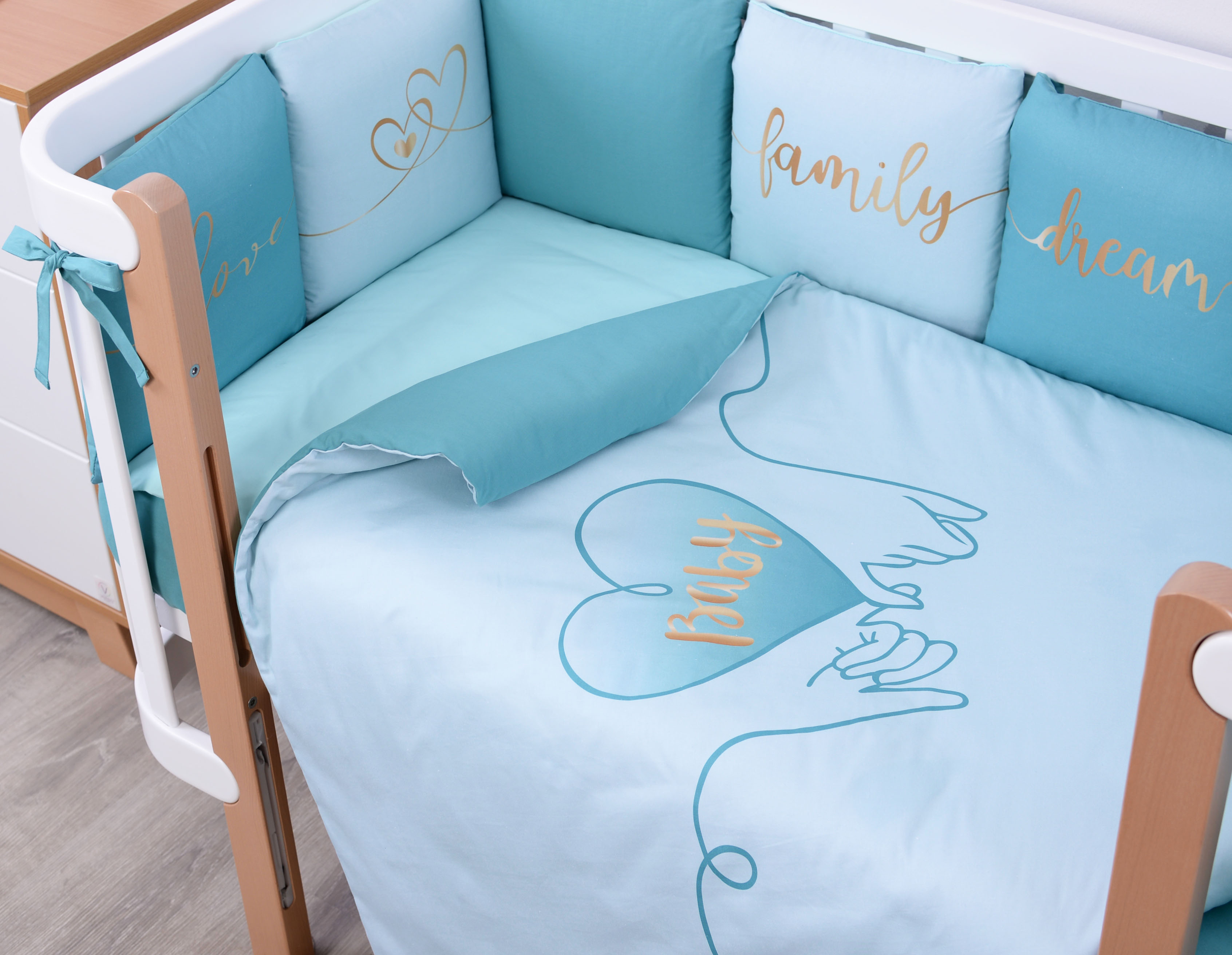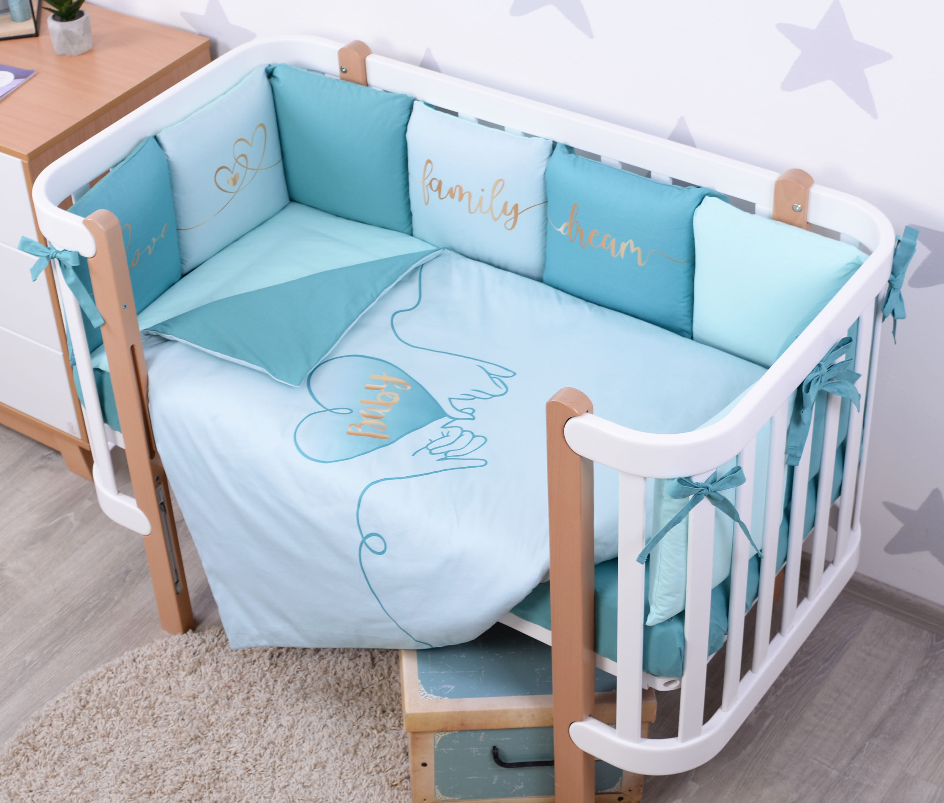 Підодіяльник і чохли бампера на блискавці - зручні і практичні у використанні. Наповнювач бампера - холлофайбер - гіпоалергенний, добре тримає форму, а подушки і ковдри - soft fiber - м'який і приємний на дотик, забезпечує дихаючі властивості і терморегуляцію. Ковдра простьобана, що забезпечує збереження форми виробу після прання.