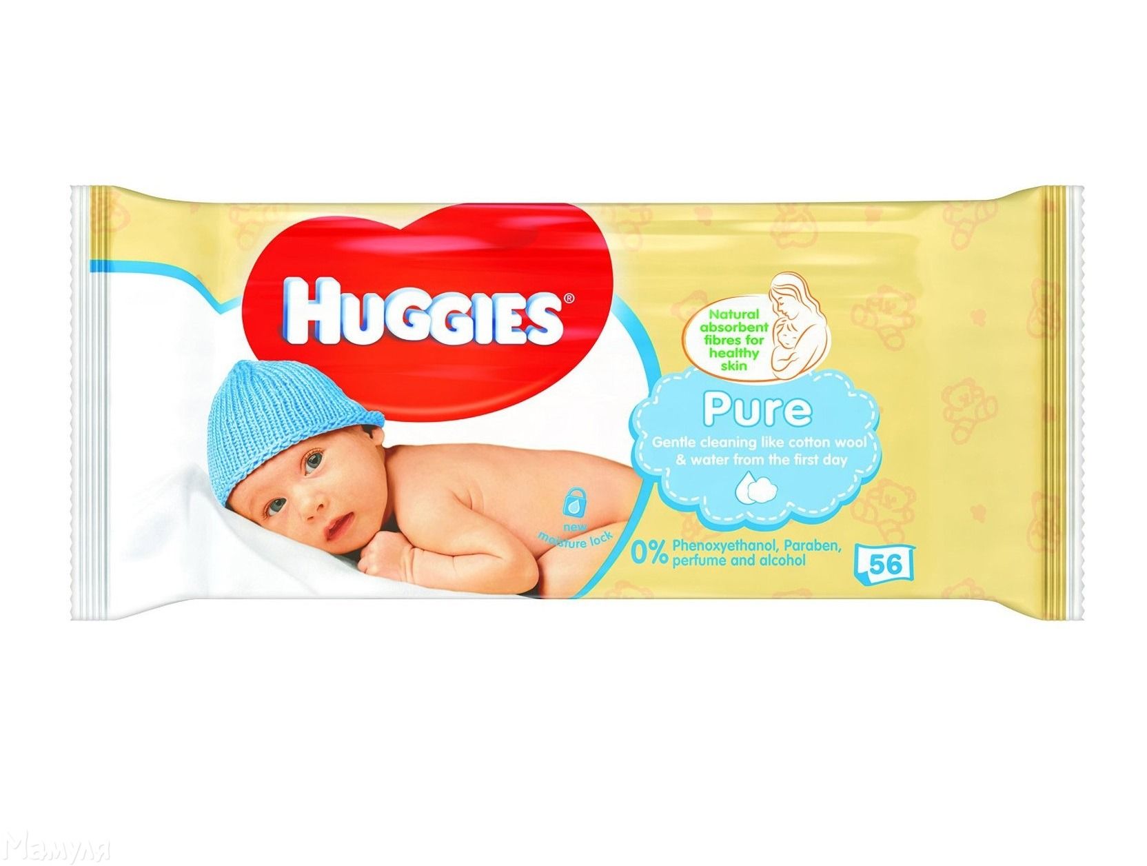 Вологі серветки Huggies Pure мають багатошарову структуру, тому швидко і легко видаляють забруднення. Для виготовлення серветок використовуються натуральні волокна – целюлоза. Серветки щільні і подібні ваті, яка просякнута водою. До складу просочення входить очищена вода і вітамін Е. Серветки не містять парфумів і спирту, мають збалансований рН. Гіпоалергенні серветки підходять для ніжної шкіри новонародженого.