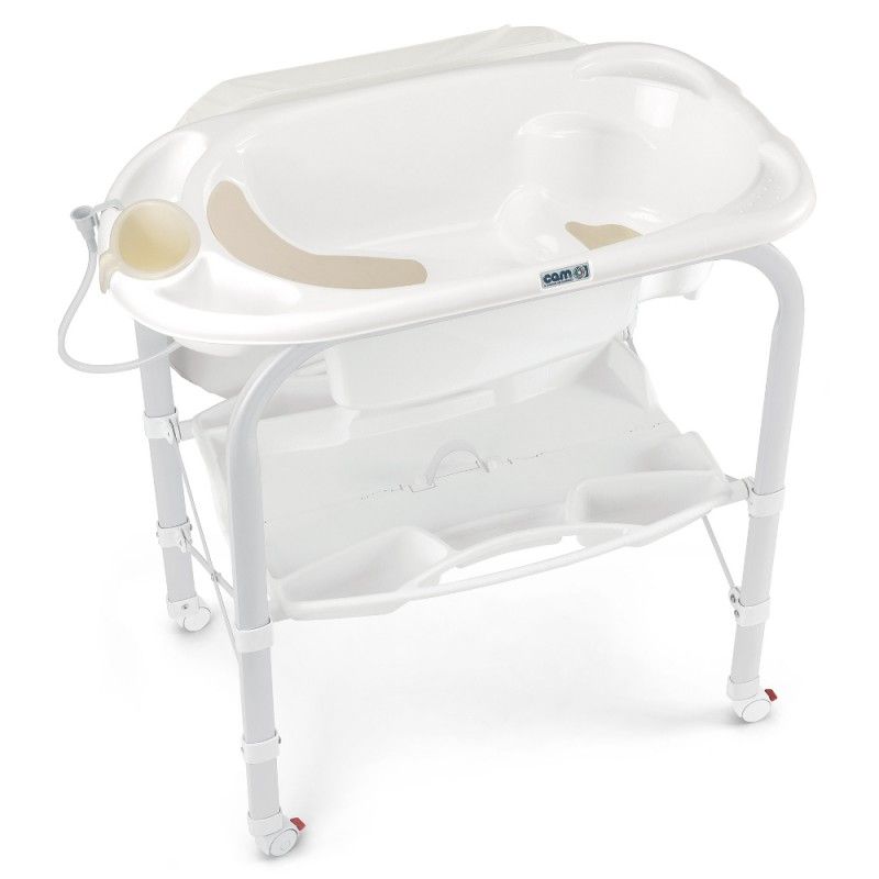 Столик имеет складную конструкцию с откидывающейся пеленальной доской, оборудован небольшой и удобной в использовании анатомической ванночкой, предназначенной для малышей до 12 месяцев с полкой-держателем для ванных принадлежностей.